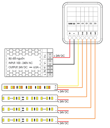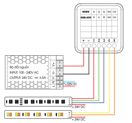 Module sẽ kết nối với 3 Led dây đơn sắc và 1 Led dây WW (Trắng ấm).