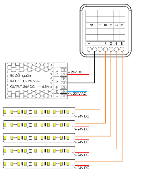 Module sẽ kết nối với 5 Led dây đơn sắc.