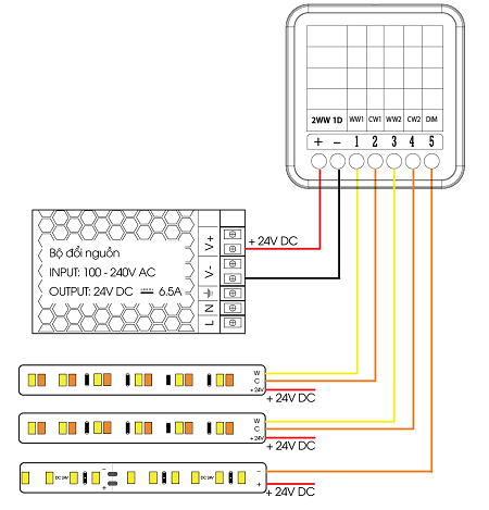 Module sẽ kết nối với 1 Led dây đơn sắc và 2 Led dây WW.